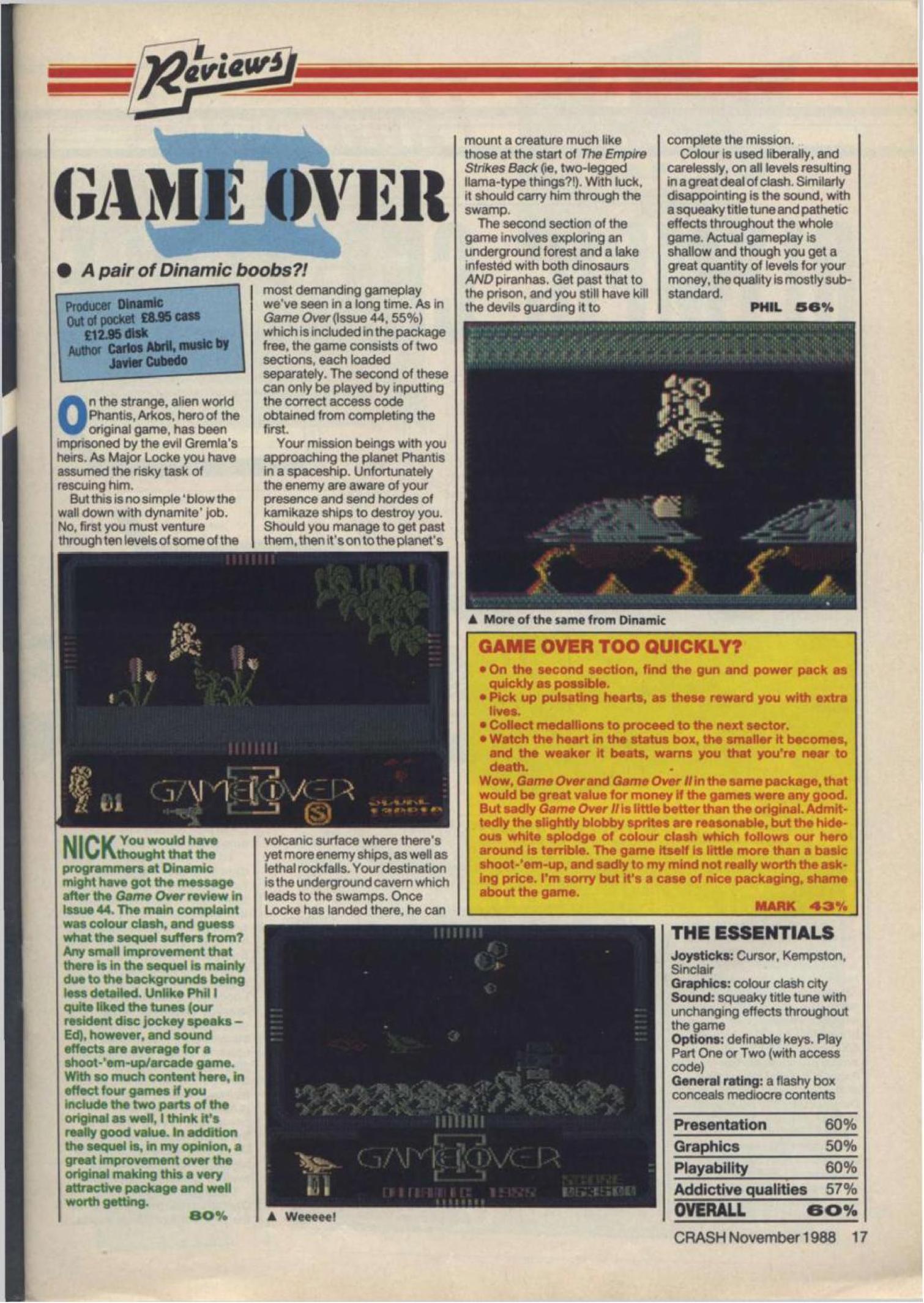Originally to be entitled Phantis, Oo-er II is a splenditious shoot 'em up in the great Dinamic tradition, featuring 10 levels of sharp shooting action, with two different loads, and many, many, different ways to splat and get splatted. You begin in Phase One by scrolling across a starfield, being pounced on by enemy ships and heading towards the surface of the planet. When you get there it's into Phase Two, where you skim the surface of the planet and avoid the gobs of volcanic splodge which belch out of the ground and threaten to fry your ship to a bag of just-cooked crisps.