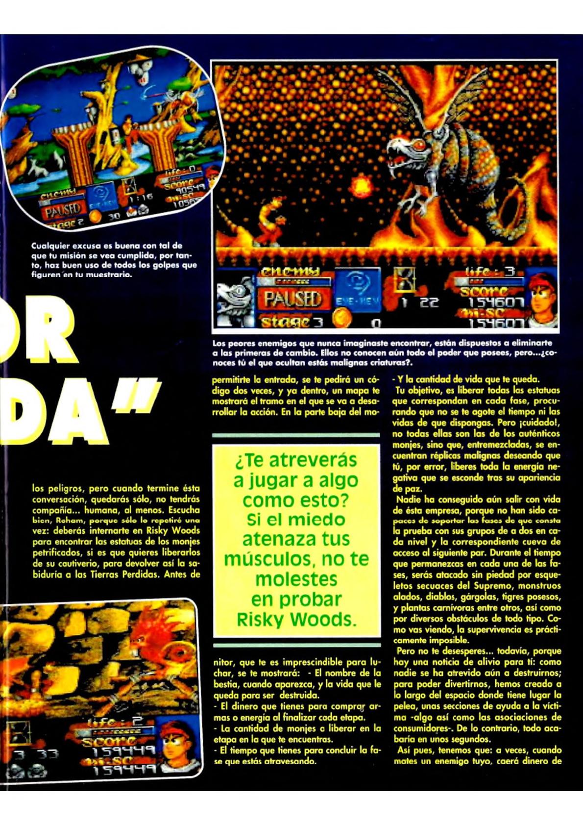 «Risky Woods» es lo mejor que nos ha proporcionado el software español en mucho tiempo. Un arcade que posee todas las mejores cualidades que podáis imaginar: rápido, adictivo, original, bien hecho... y un montón más de interesantes características, como una banda sonora sencillamente apabullante, que le convierten en un magnífico programa.